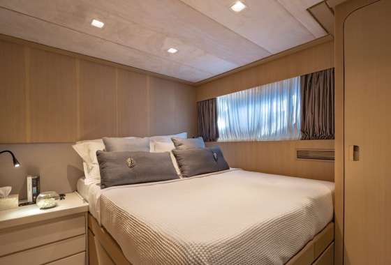 The yacht is decorated in neutral tones that create an elegant and relaxing atmosphere, and is suitable for hosting up to 12 guests in 6 luxurious cabins: a spacious master suite, a VIP cabin on the main deck that can also be converted into a playroom, and four additional cabins with twin beds – some of which can be converted into double beds. Each cabin has its own private bathroom and full air conditioning for perfect comfort.
