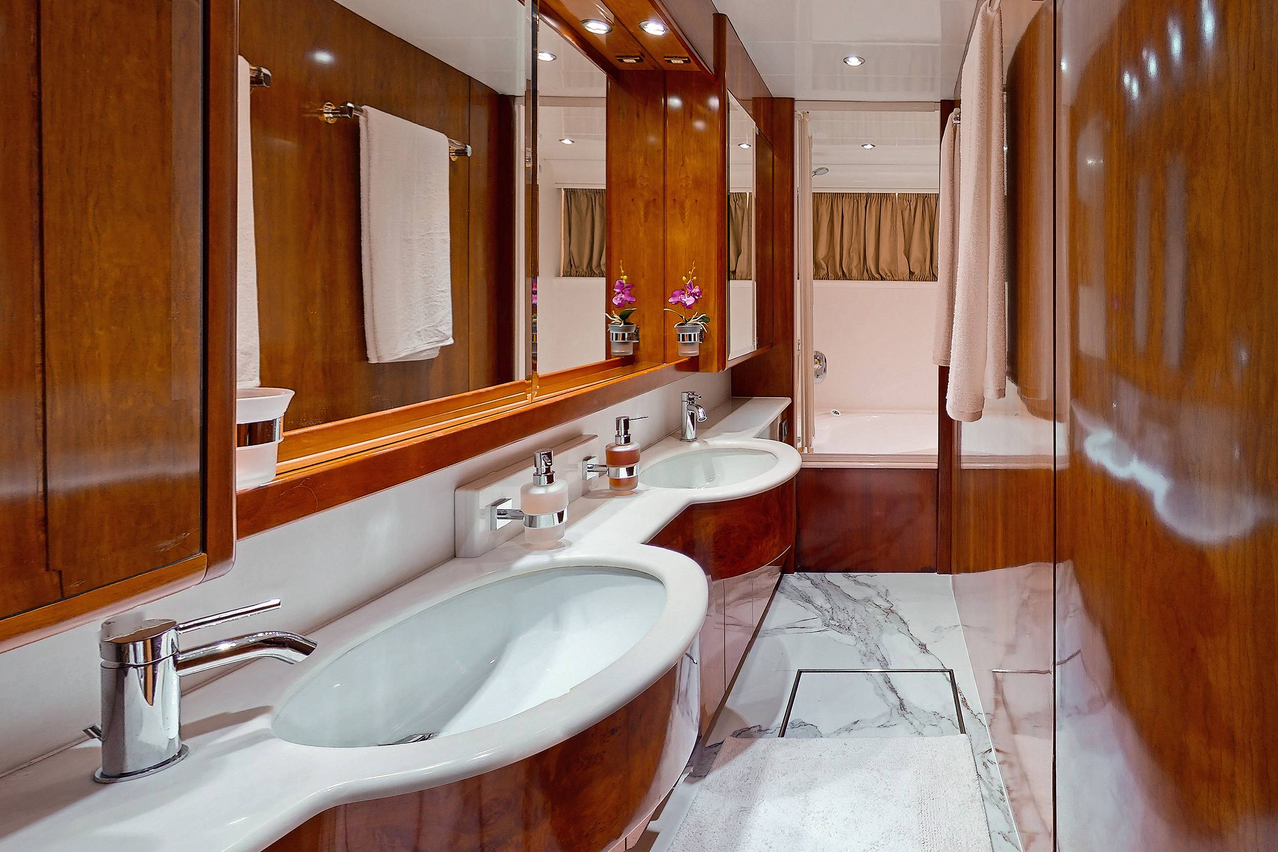 She is 23.90 meters long and accommodates up to 10 guests in 4 suite-level cabins: 1 Master cabin, 1 VIP cabin, and two twin cabins that can be converted into doubles, each also featuring an additional pullman bed. All cabins include air conditioning and en-suite bathrooms, making her ideal for families, couples, and friends.
